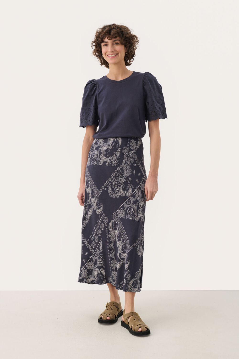 This elegant midi skirt features a glossy finish and a soft A-line shape that adds a feminine touch. The smooth fabric and simple cut make it suitable for both everyday styling and special occasions – pair it with a knit or shirt.